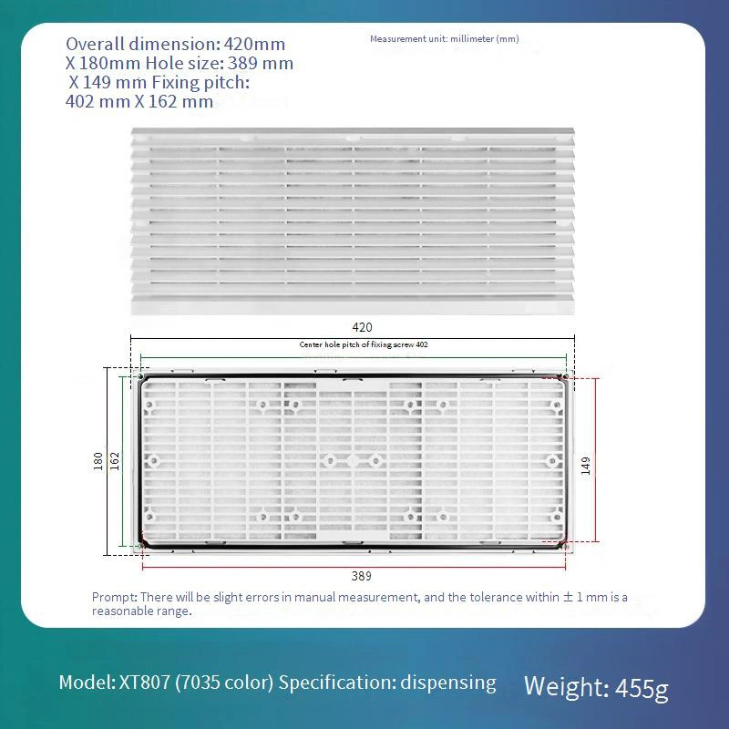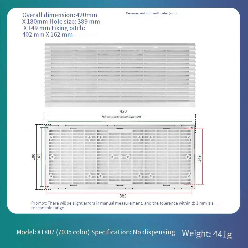 எளிதான தினசரி பராமரிப்பு மற்றும் மாற்றீட்டிற்கான மாற்றக்கூடிய வடிகட்டி கண்ணி வடிவமைப்பைக் கொண்டுள்ளது, இது நீண்டகால இயக்க செலவுகளை கணிசமாகக் குறைக்கிறது. பிரேம் அமைப்பு ஒரு நிலையான வெள்ளை-சாம்பல் 7035 வண்ணத்தில் கிடைக்கிறது. இது ஒரு ஏபிஎஸ் பொருளிலிருந்து கட்டப்பட்டுள்ளது, இது சிறந்த சிதைவு எதிர்ப்பை வழங்குகிறது, இது நீண்டகால ஸ்திரத்தன்மையை உறுதி செய்கிறது.